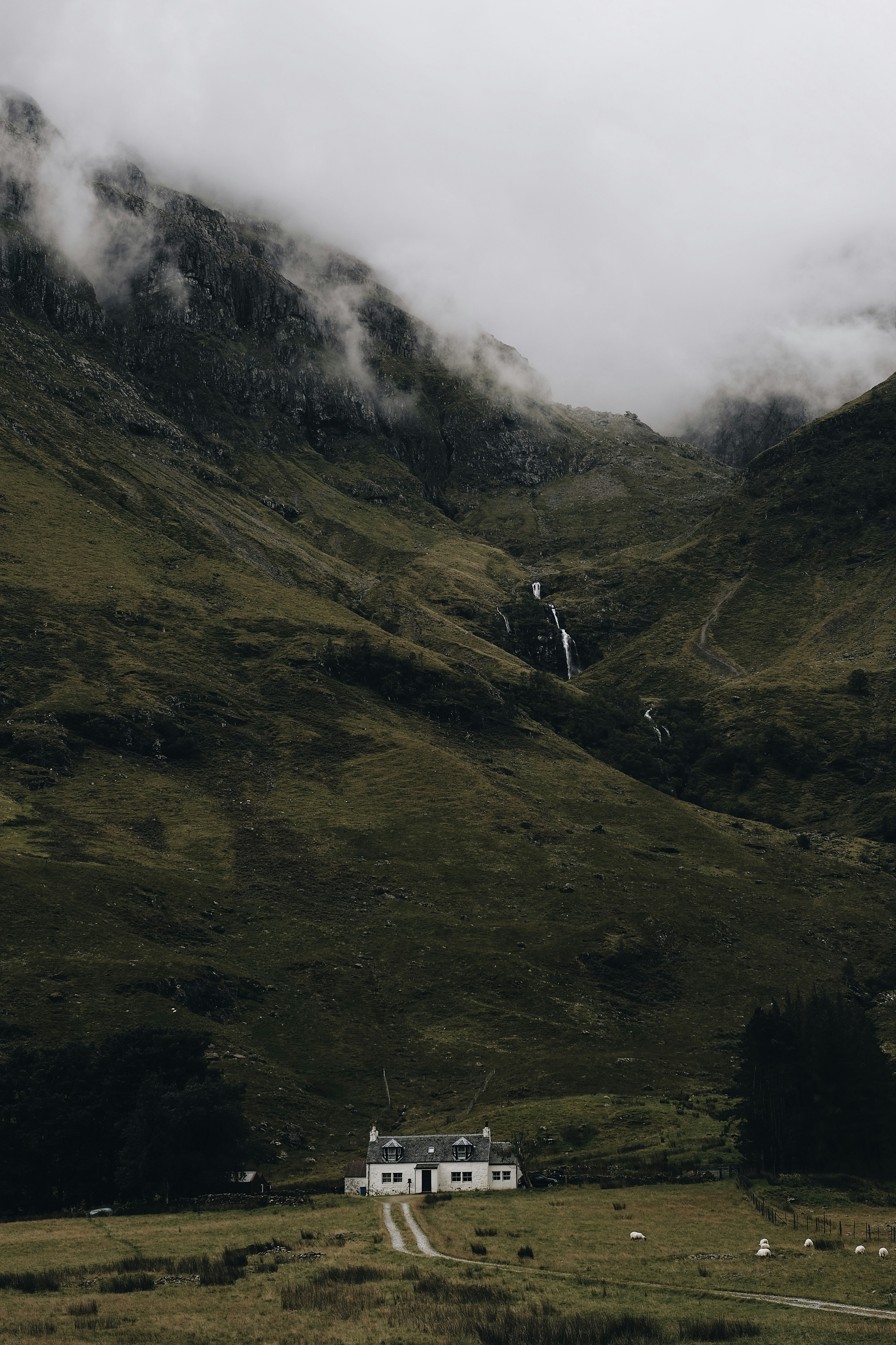 House at the base of a mountain with clouds and a waterfall on the rocks of the mountain